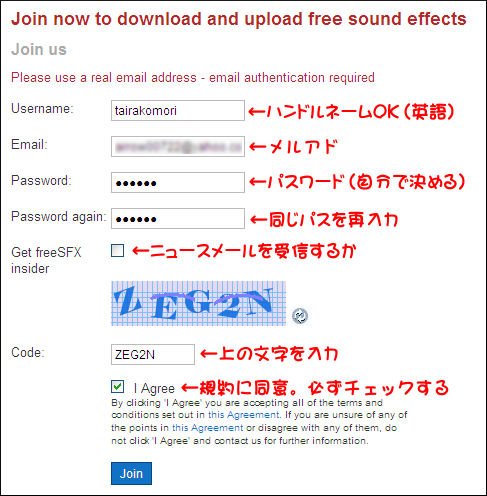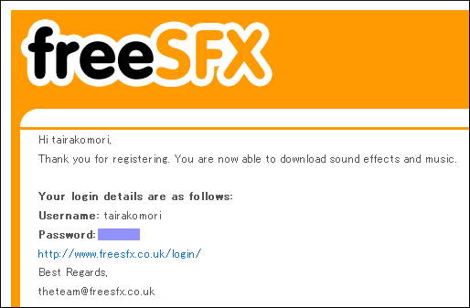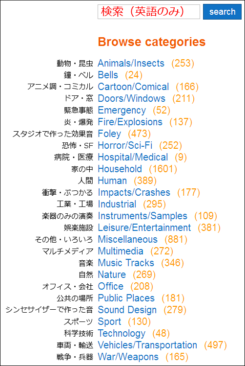 http://www.freesfx.co.uk/約7700音・mp3/商用可/要登録/著作表示必須 ここはイギリスの無料効果音サイトです。その数、なんと約7700音!(2013/10 現在)。英語での簡単な登録が必要ですが、その価値は十分にあります。尚、音を視聴するだけなら登録は不要です。 何故こんなに音が多いのかというと、いろんな人がここに音をアップしているから。似たモノでhttp://www.freesound.org/や、日本ではニコニ・コモンズという巨大サイトがありますが、それらとの違いは、ここは利用規約が統一されているという点です(freesound.orgとニコニ・コモンズは一つ一つの音ごとにアップした人が規約を決める)。なので、自由度という点で使いやすいサイトだと思います。 ・・・・・・・・・・・・・・・・・・・・・・・・・・ 登録方法