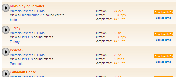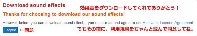 ![]() 左の再生ボタンで試聴できます。ただ、たまに聴けない音が混じっているみたいです。 右側の『Download MP3』を押すと、 ![]() 『 I agree 』(同意する)を押して、音をダウンロードして下さい。 次のページで利用規約を翻訳しています。