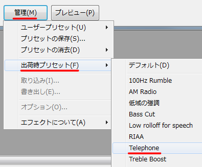 (アナログ)電話の音声周波数帯域は300〜3400Hzだそうです。ですので、Filter Curveで300Hz以下の低音と3400HZ以上の高音をカットします。音質をわざと落とすわけです。では実際にやってみましょう。