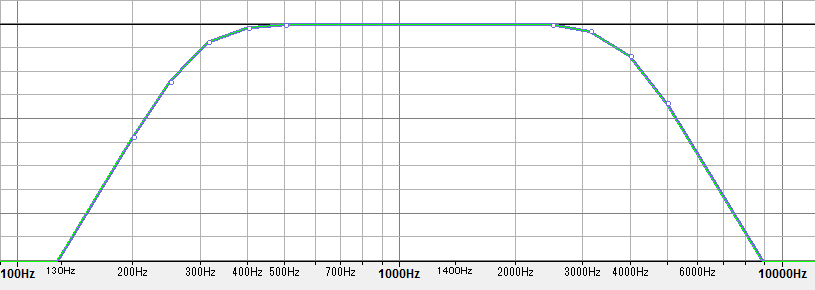 ![]() 電話の音声周波数帯域である300〜3400Hz以外の部分の音域が、下げられているカーブが出てきます。で、OK。