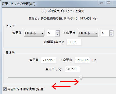 「エフェクト」→「変更:ピッチの変更」 |