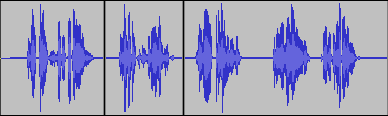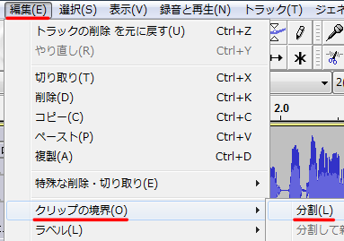 声と声の間にカーソルを持ってきて、「編集」→「クリップの境界」→「分割」