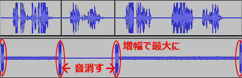 兵士の声のノイズ部分の冒頭と終わりの0.1〜0.2秒を選択し、増幅で最大にします。