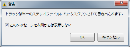 書き出す時にこの表示が出たら、「このメッセージを次回からは表示しない」にチェックを入れてOKしてください。複数トラックを1つの音声として書き出す場合は必ず合成されるので。